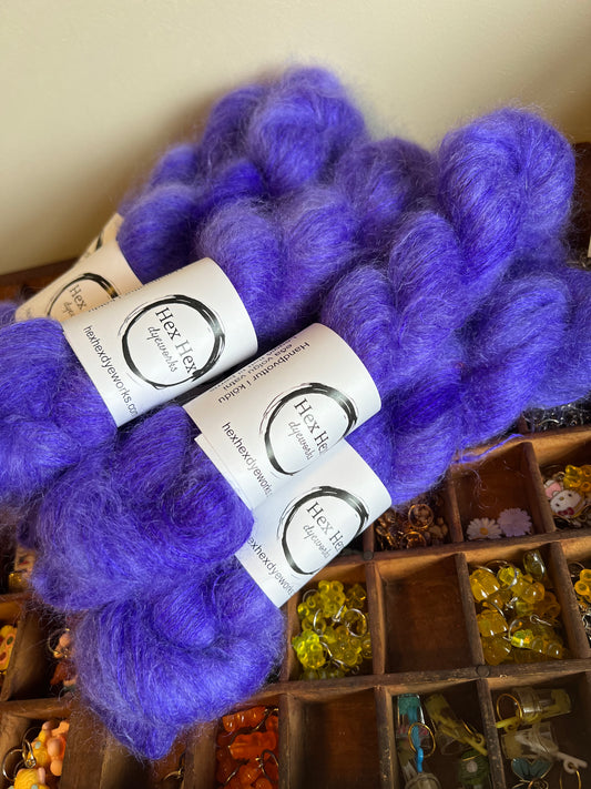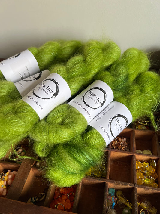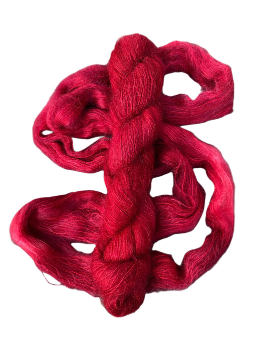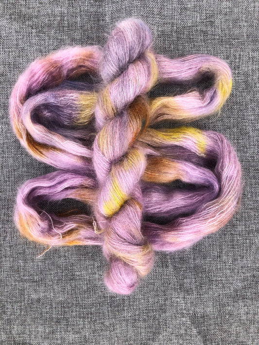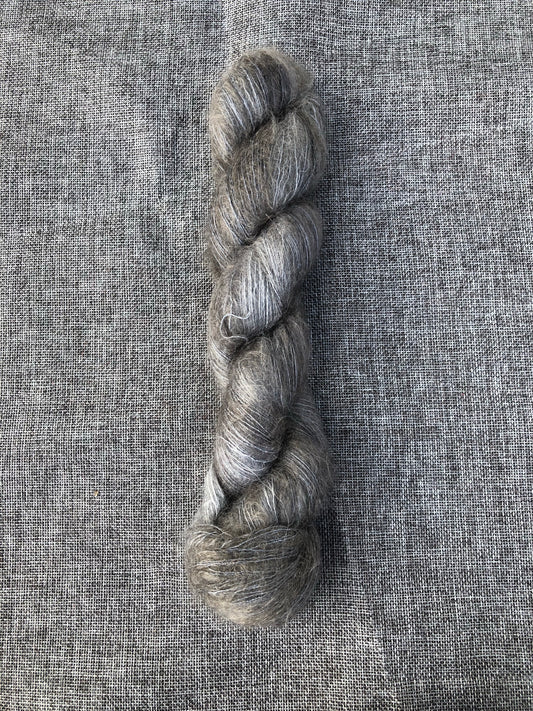 72% kid mohair og 28 % silki, 1ply, 420m í 50g. Ráðlögð prjónastærð er 2mm-5mm eftir verkefnum.