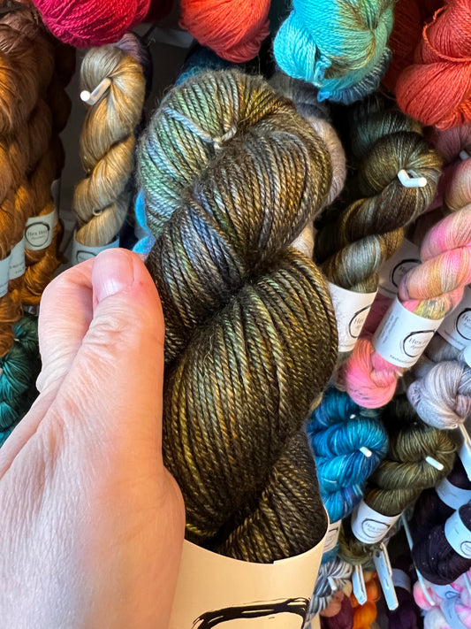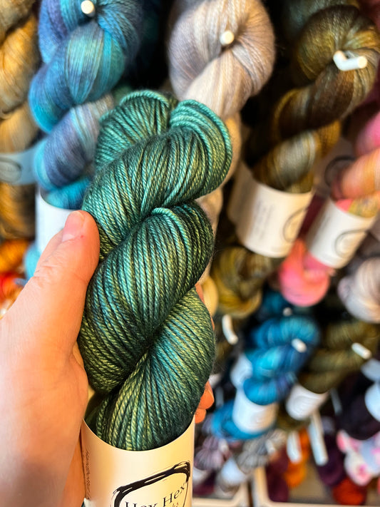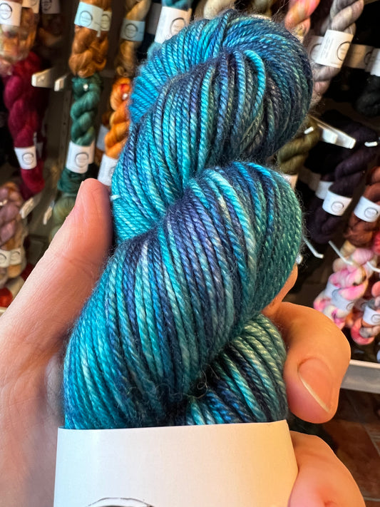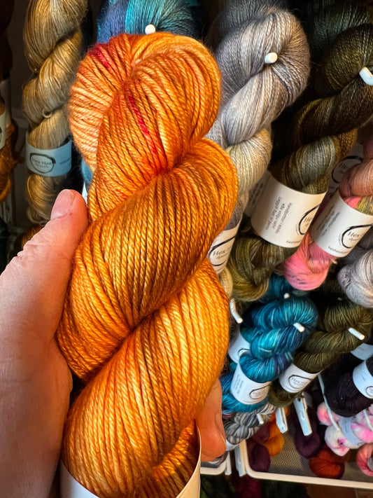 50/50 merino/silki superwash DK. 212m í 100g, 4 ply. Yndislega mjúkt DK garn með frábæran glans og gott “drape”